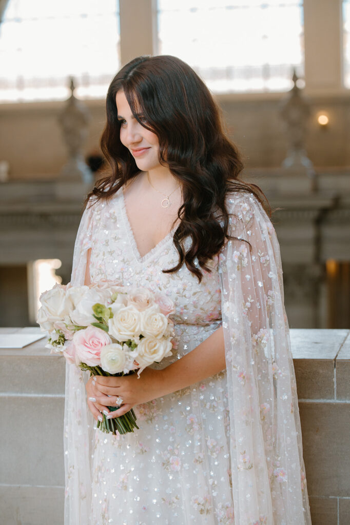 The wedding ceremony was held at 9:00 am in May on the 4th floor of San Francisco City Hall, an ideal choice for couples planning a larger City Hall wedding. With 60 guests in attendance, the space felt both intimate and grand, framed by classic architecture and soft morning light.