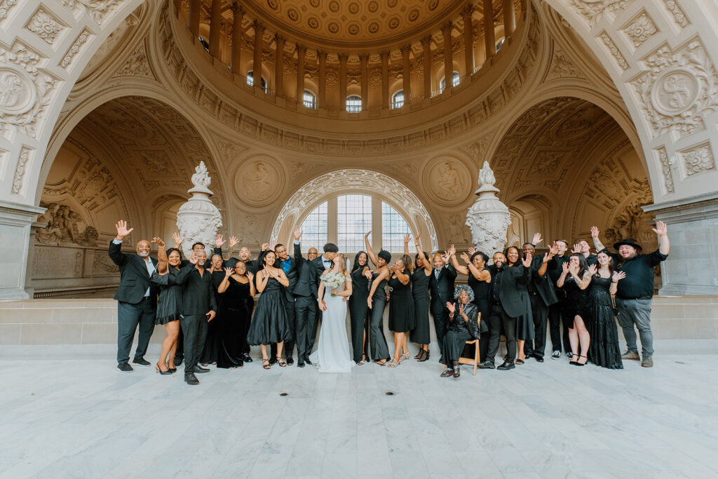 This San Francisco City Hall wedding was a true celebration in every sense — elegant, vibrant, and filled with the energy of a large group of loved ones. Hosted on the 4th floor of City Hall, the couple chose a setting that perfectly balanced grandeur with privacy, making it ideal for a wedding with many guests.